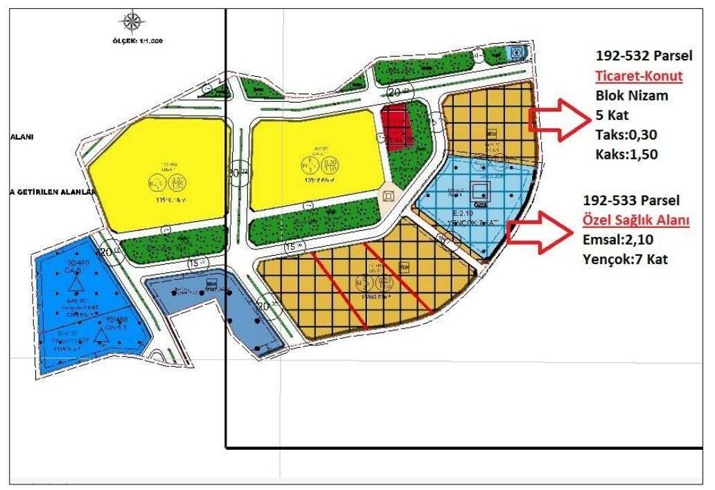 1/1.000 ölçekli Uygulama İmar Planı değişikliği 20.07.2022 tarihli ve 5819 sayılı Cumhurbaşkanı Kararı ile onaylanmıştır. 192 ada, 522 parselden ifraz sonucu oluşan 192 ada, 533 parsel “Özel Sağlık Tesis Alanı” alanında kalmıştır. Parselin yapılaşma koşulları E=2,10, ve Y en çok 7 kat olup Ön bahçe mesafesi 10 metre, yan ve arka bahçe mesafesi 5 metredir