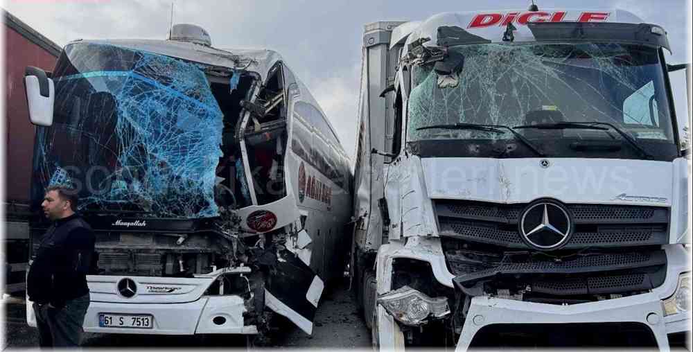 Erzurum-Pasinler karayolunda meydana gelen trafik kazasında 1 tır, 1 yolcu otobüsü ve 1 otomobil zincirleme kazaya karıştı.